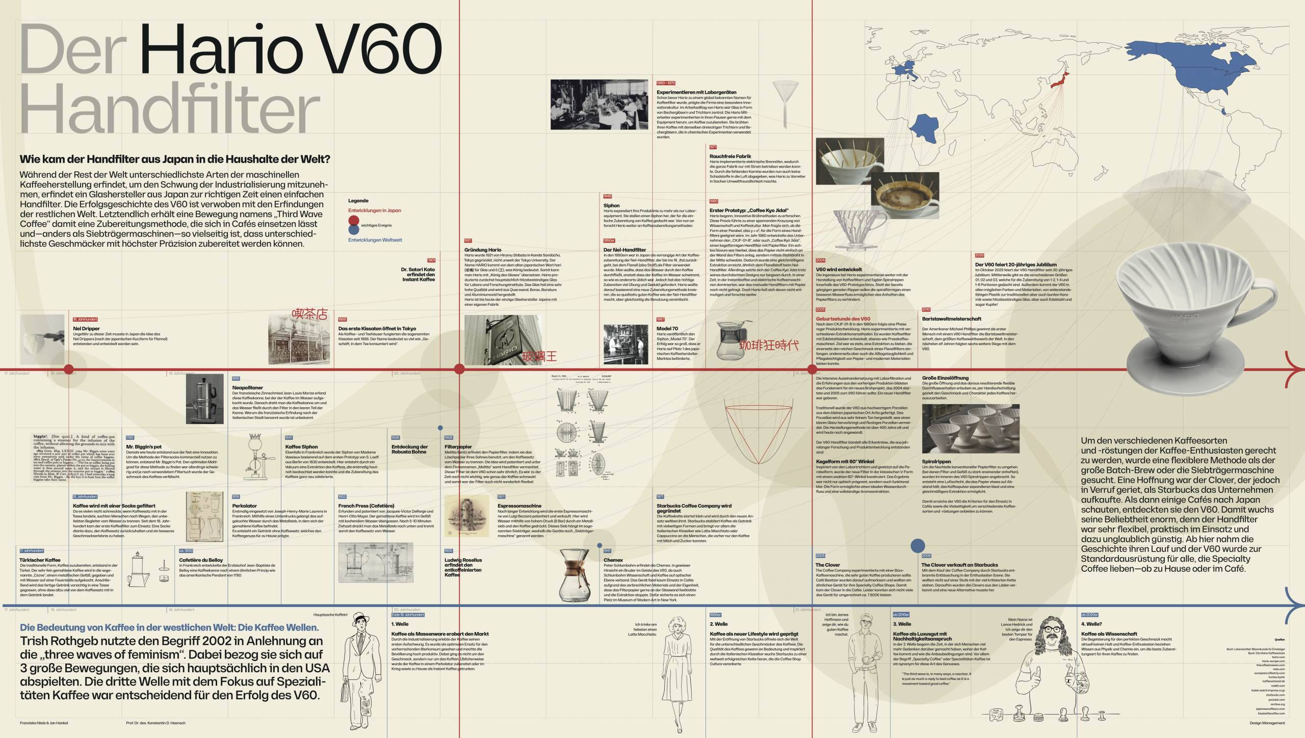 This research poster traces the global genealogy of coffee-brewing technologies—from early filtration practices in the Ottoman Empire and eighteenth-century Europe to twentieth-century paper filters, siphons, espresso machines, and the emergence of Japanese craft traditions—culminating in the development of the Hario V60 hand filter. It situates the V60 within a long lineage of experimentation between laboratory science and domestic practice, showing how material innovation, environmental production methods, and design engineering (such as spiral ribs, a 60-degree cone angle, and controlled flow dynamics) shaped its rise as a flexible, precision-oriented brewing device.