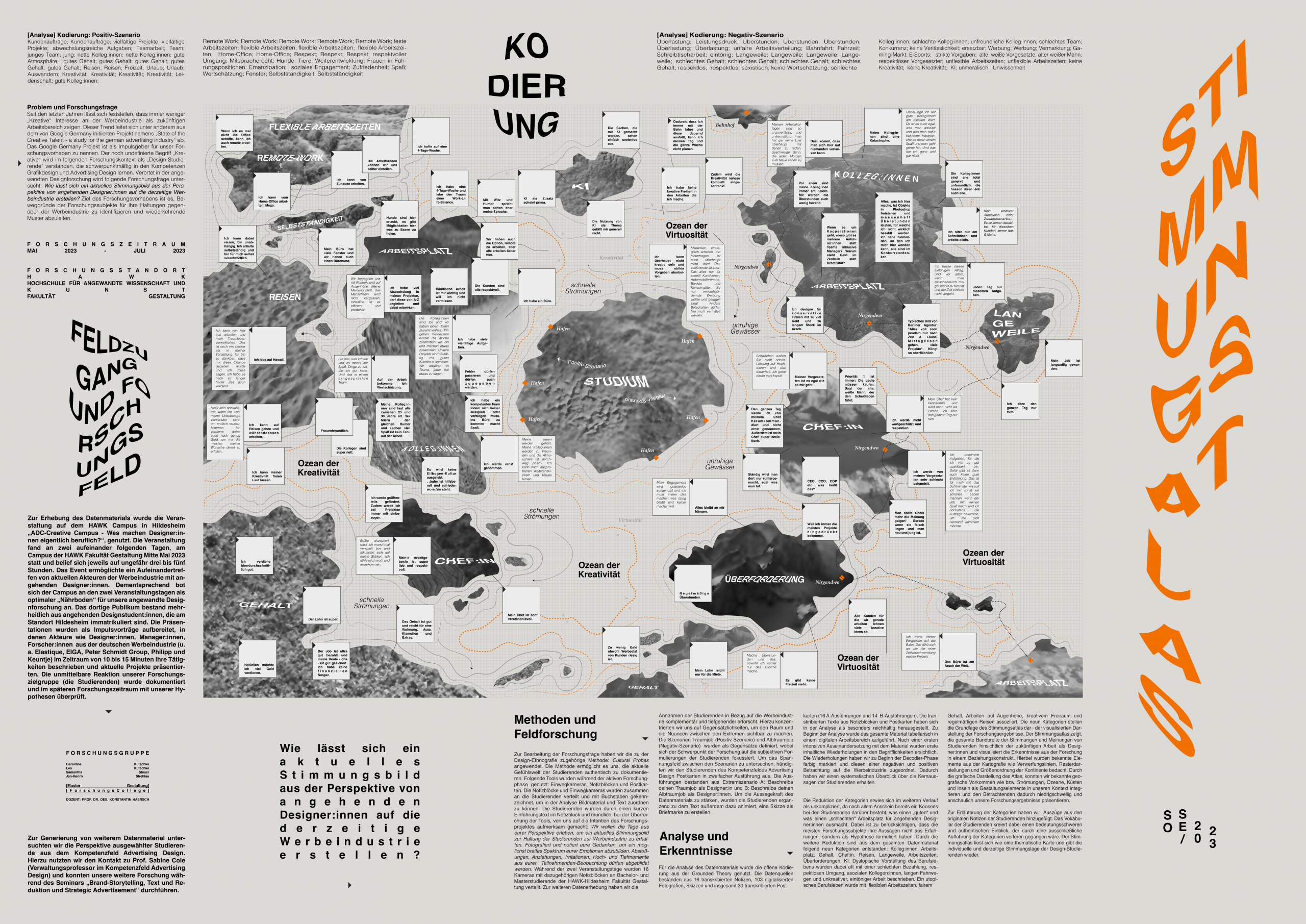 The research poster investigates contemporary working moods in the creative industries—especially among designers and advertising professionals—through an exploratory, qualitative field study. Using ethnographically inspired field research, participants were asked to externalize experiences of pressure, collaboration, routine, creativity, and overload. These accounts were then translated into a large-scale visual mapping system (“Stimmungsatlas”) that spatializes affects, conflicts, and everyday work dynamics across metaphorical terrains such as islands, oceans, and zones of tension. The approach combines interpretive coding, clustering, and speculative cartography to make emotional and organizational patterns legible.