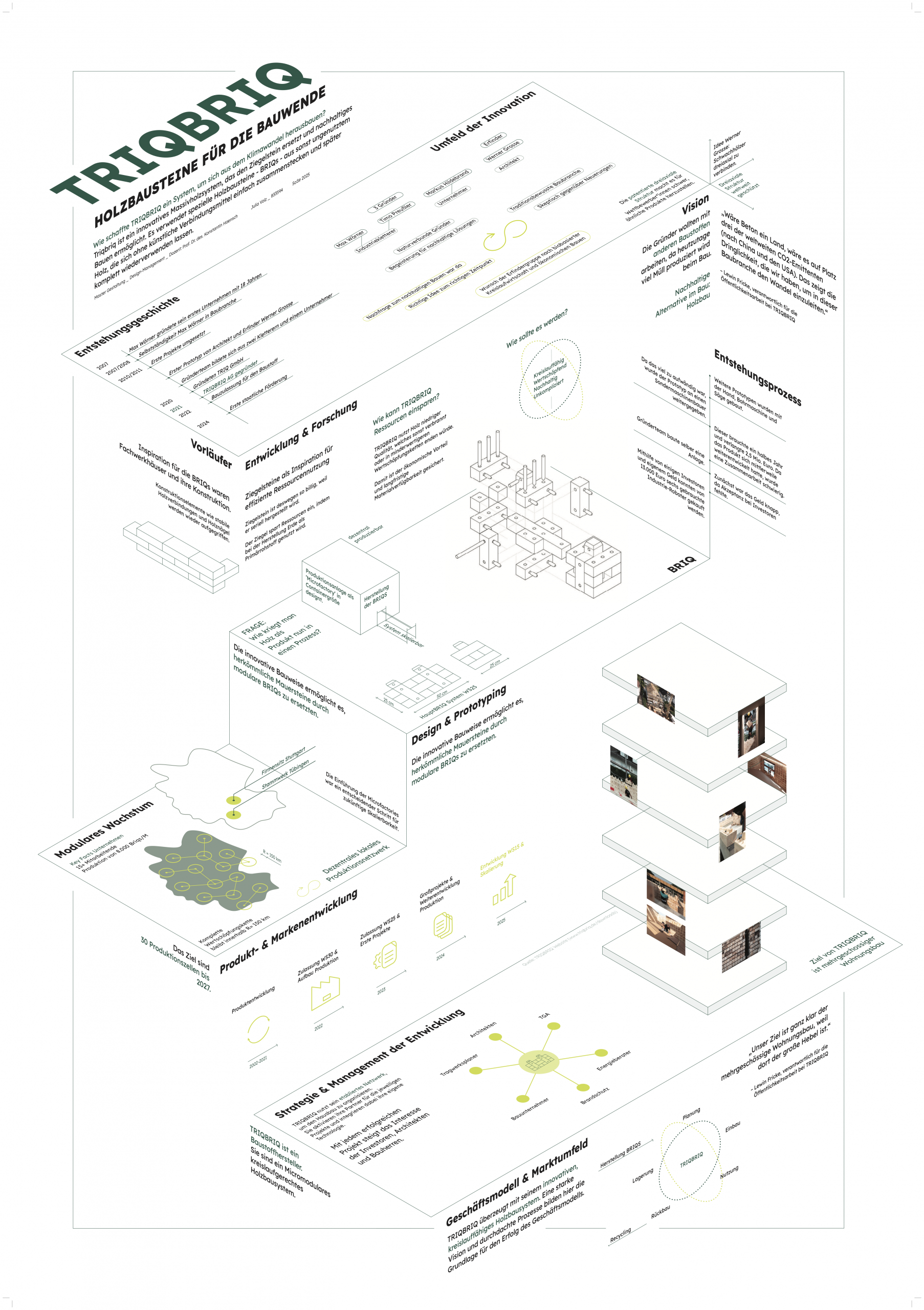 The seminar work analyzes TRIQBRIQ as a case study in sustainable construction innovation, focusing on how modular solid-wood blocks (BRIQs) can replace conventional masonry while enabling circular, low-carbon building practices. The system uses lower-grade wood that would otherwise be burned or down-cycled, assembling it into patented, three-axial elements that require no synthetic binders and can be dismantled and fully reused. The presentation mapped the company’s long development path—from early prototypes and inspirations from historic timber construction to regulatory approvals, pilot projects, and scaling strategies—highlighting decentralized “microfactory” production cells and regional value chains as key to growth and carbon reduction.