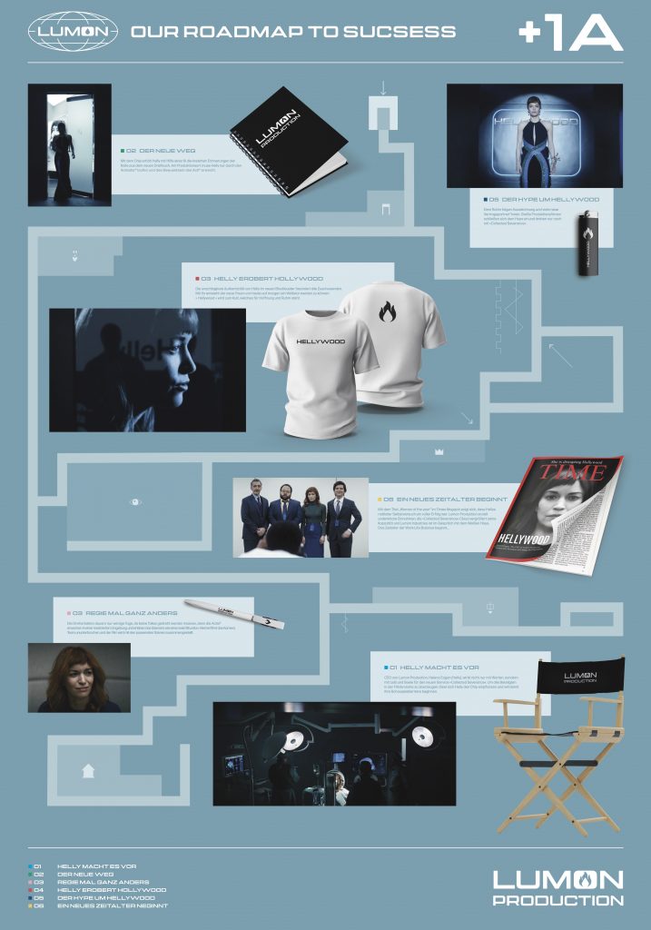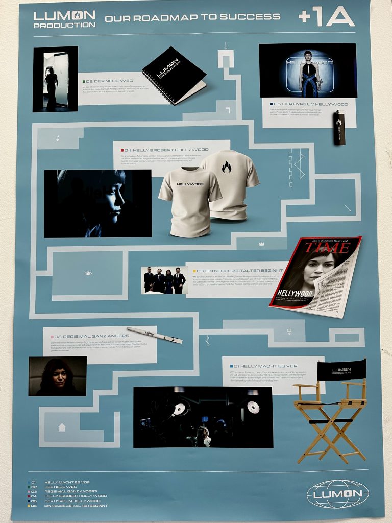 The proposed solution positions Lumon Production as a service provider that implants and trains role-specific memories in actors via AI-supported processes, enabling them to “live” rather than perform characters. The concept includes an Activator® system at the production site and a subscription-based cloud infrastructure for storing and reactivating roles across productions . Through scenario-building and a visual roadmap (“Our Roadmap to Success”), the poster demonstrates how speculative design, strategic foresight, and entrepreneurial modeling can be combined to prototype new value propositions and critically examine the socio-economic implications of technological innovation in creative industries.