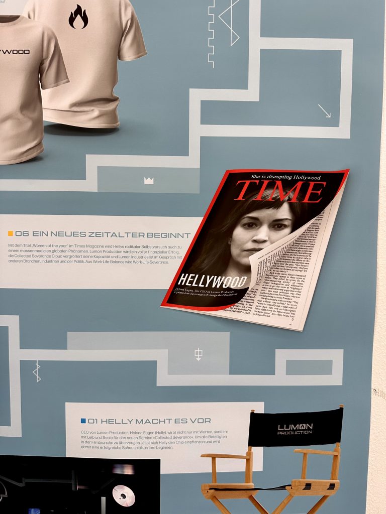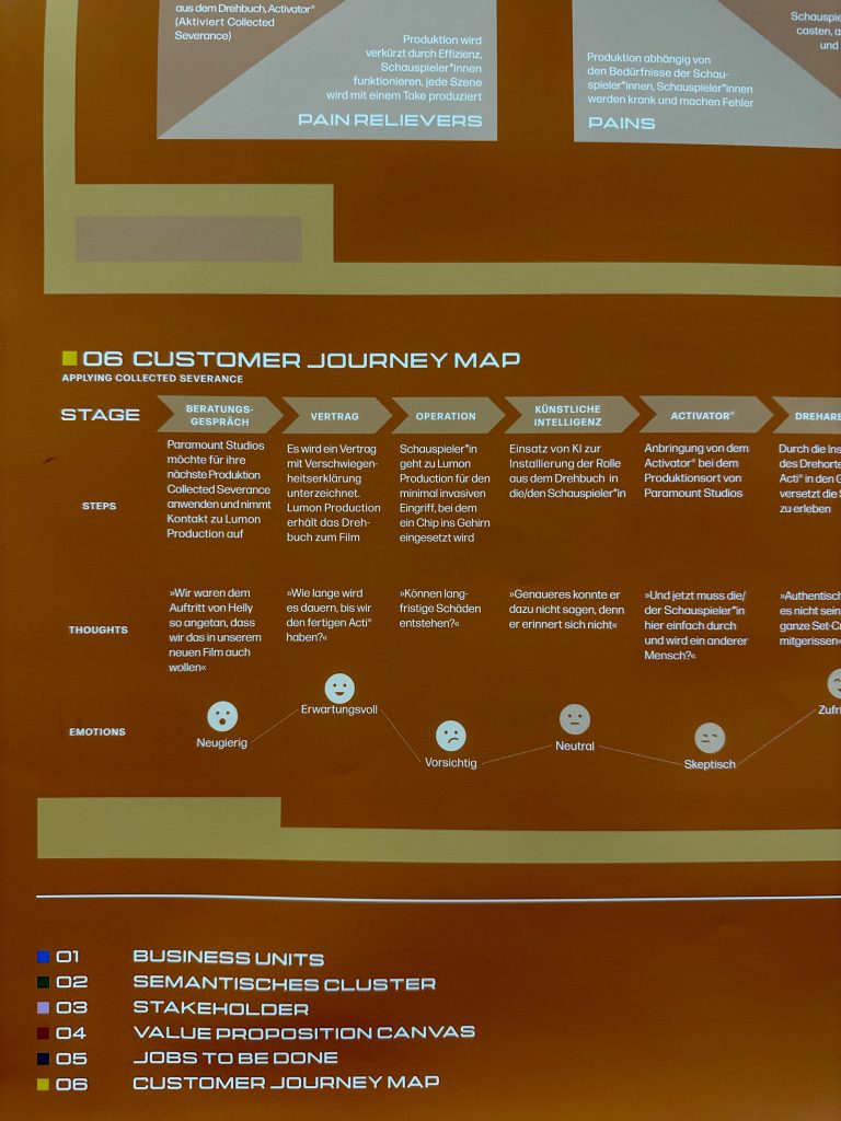 The research poster develops a speculative strategic concept for expanding the fictional biotechnology company Lumon Industries into the film industry through a new service titled Collected Severance. Building on the narrative universe of Severance, the project translates a fictional neuro-technological procedure into a strategic business model. Using established design management tools—including Business Unit analysis, Stakeholder Mapping, Jobs-to-be-Done, Value Proposition Canvas, and Customer Journey Mapping—the poster systematically explores Hollywood as a target B2B market and identifies inefficiencies in film production (e.g., time overruns, repeated takes, rising costs) as key pain points.
