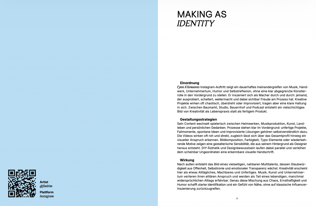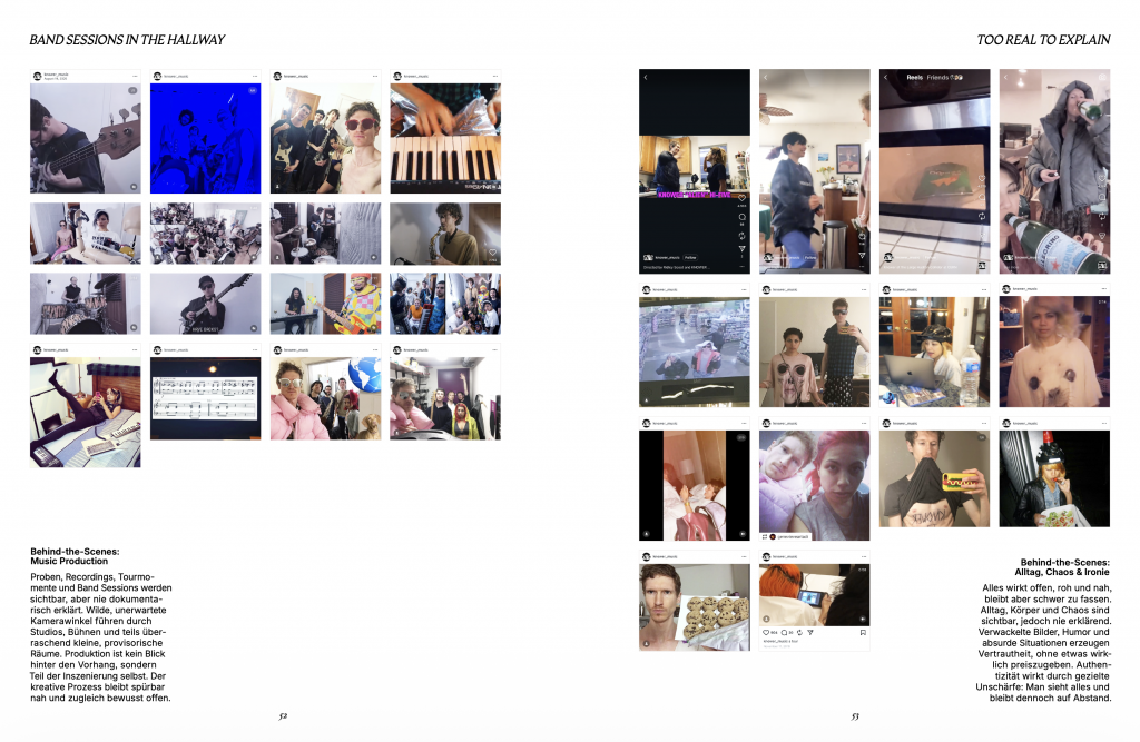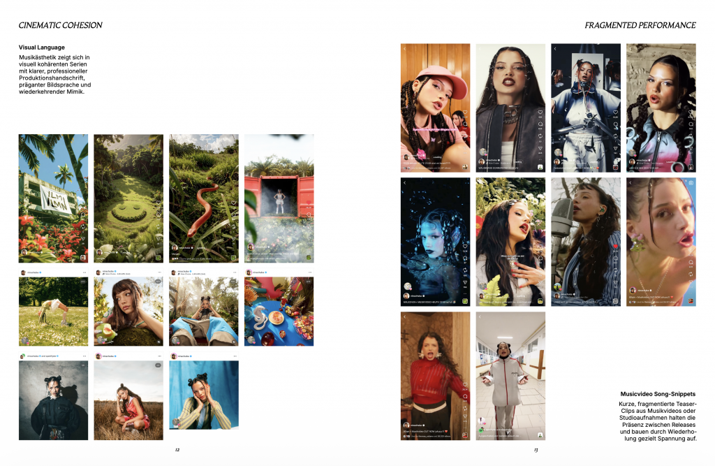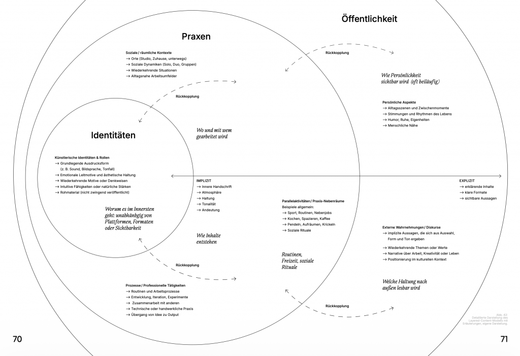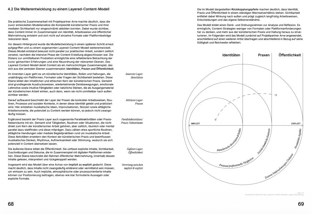 Methodologically, the thesis combines theoretical analysis with an exploratory platform study and a practice-based design process. Through qualitative observation of TikTok, Instagram, and YouTube, recurring content formats and strategic patterns are collected, clustered, and systematized. Complemented by exploratory conversations with jazz musicians, these insights lead to the development of a “layered content model” that structures different sources and levels of content generation. This model is subsequently tested and refined through a collaborative design process with a jazz musician, including workshops, prototyping, and iterative video production.