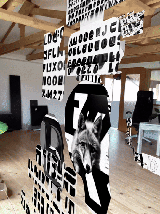The poster was also translated into a spatial experience and presented as part of a 3D / augmented-reality installation, where visitors could navigate the arguments and visual experiments immersively—turning typographic research into an embodied, exploratory encounter rather than a purely static graphic artifact.