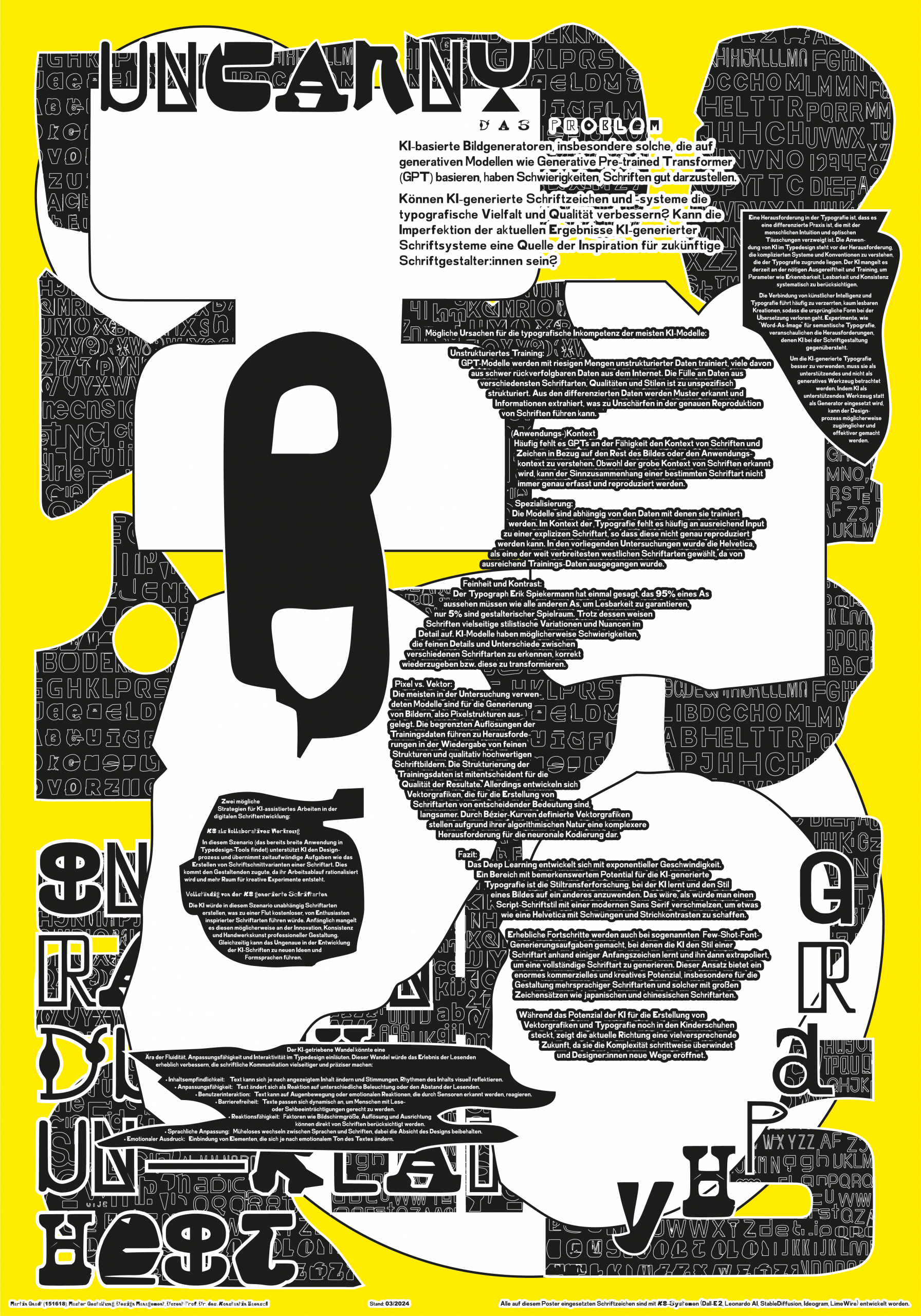 This research poster examines why contemporary AI image generators—especially GPT-based systems—still struggle with high-quality typography, and how these limitations might become productive for future type design. It analyzes technical causes such as unstructured training data, weak contextual understanding of letterforms, limited typographic specialization, and the difficulty of reproducing fine contrast and stylistic nuance when working primarily with pixel-based image models rather than vector logic. At the same time, the project explores emerging opportunities: AI as a collaborative design partner, as a generator of speculative or hybrid letterforms, and as a catalyst for new workflows in multilingual and complex writing systems.