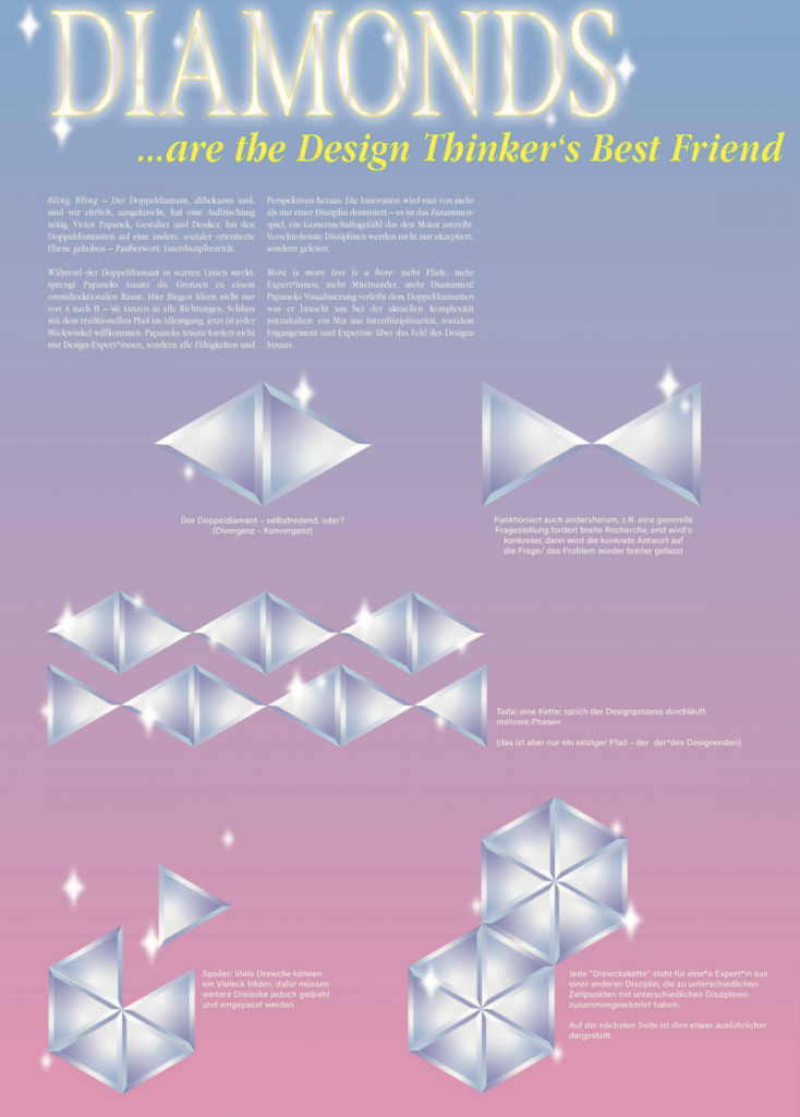 Across thematic spreads—on Design Thinking as a “Trojan horse,” on process models visualized as crystalline systems, and on culture jamming inspired by Adbusters—the project exposes how design methods can reproduce economic imperatives while claiming ethical neutrality. Counter-positions are developed through an extended discussion of Social Design and social innovation, drawing on thinkers such as Ezio Manzini and concrete cases like Italian co-housing initiatives to argue for collaborative, NGO-oriented, and service-based approaches to systemic change.