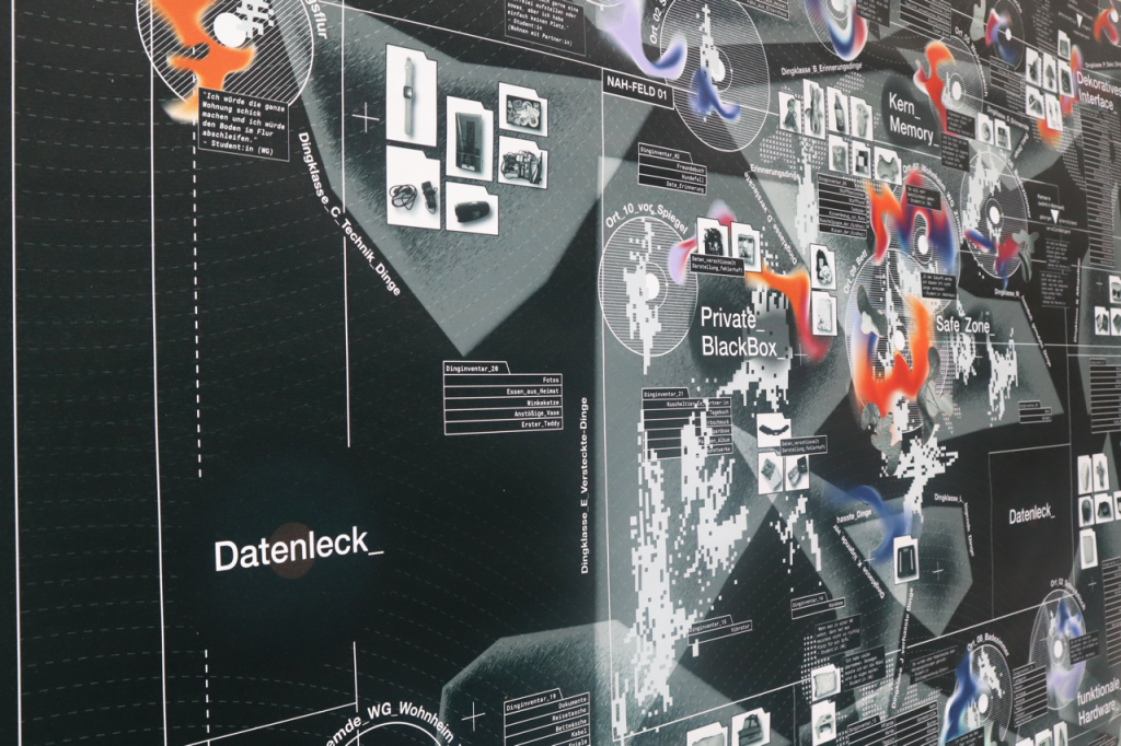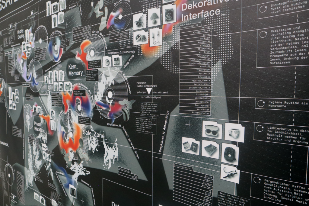 For this reason, the medium of mapping is particularly suited to the visual articulation of the topic. Maps possess the capacity to spatially situate elements and to register simultaneity through layered structures. Student living is here subjected to a process of operationalization: broken down into its many components—objects and furniture, rooms and people—before being overlaid with moods and intensities. These granular elements are then recomposed to form a new image. They are organized according to an overarching topographic logic, positioned between near and distant zones and oriented around six poles. Following a diagrammatic rationale, they are complemented by metaphorical labels that delineate regions and provoke new associations. What emerges is a field of tensions concerned with temporality and affect.