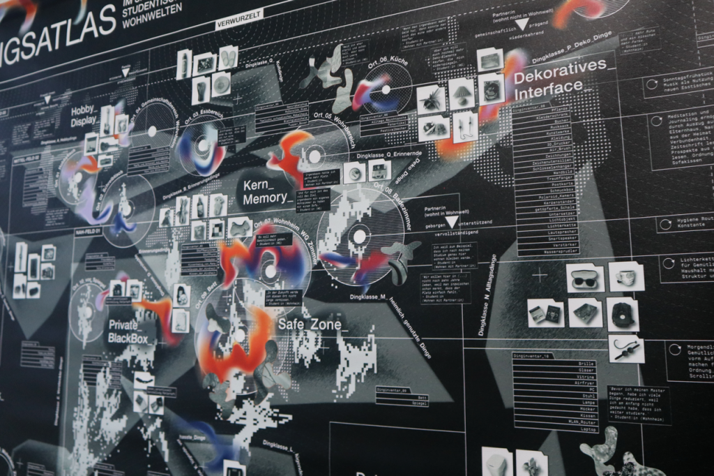 The material for the Mood Atlas was gathered through qualitative design research methods. Cultural probes enabled deep insights into the everyday lives of ten students—whether living in shared flats or with partners—each maintaining a distinct relationship to their domestic environment. This approach was supplemented by interviews, excerpts of which appear throughout the atlas in the form of quotations.