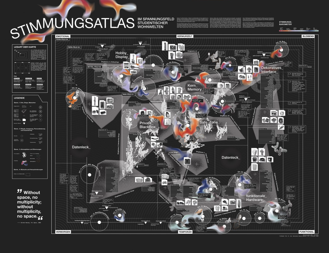 Hier kommt Design ins Spiel, welches sich mit Wissenschaft verbindet und eine neue und hochaktuelle Schnittstelle bildet. Dieser Stimmungsatlas soll das Thema des studentischen Wohnens beleuchten. Doch nicht im klassischen Sinne mit Daten und Fakten über Wohnformen oder Berichten über Mietkosten. Er soll das abbilden, was zwischen eben diesen Zahlen verborgen bleibt. Dieser Atlas gibt Einblick in Raum als vielschichtiges Konzept, welches über die bloße physische Erscheinung hinausgeht und betrachtet diesen als multikomplexes System, in dem Überlagerungen, Tendenzen und Mehrdeutig- keiten stattfinden. Deshalb eignet sich das Medium Karte für die visuelle Aufbereitung dieses Themas. Karten haben die Kraft Elemente räumlich zu verorten und Gleichzeitig- keiten durch Layer abzubilden. Das Thema des studentischen Wohnens unterzieht sich hier einer Operationalisierung. Es wird aufgeteilt in seine vielen Bestandteile, angefangen bei einzelnen Dingen und Möbel, hin zu Räumen und Menschen, die dann überlagert werden von Stimmungen und Ausprägungen. Die granularen Elemente setzen sich neu zusammen und bilden ein neues Bild. Dabei werden sie in eine übergeordnete, topografi- sche Logik eingeordnet, verorten sich zwischen Nah- und Fernbereich und orientieren sich an sechs Polen. Sie folgen einer diagrammatischen Logik und werden ergänzt durch metaphorische Bezeichnungen, die Bereiche aufzeigen und neue Assoziationen wecken. So entsteht ein Spannungsfeld, welches sich mit Zeitlichkeit und Stimmung auseinandersetzt. Die Inhalte für den Stimmungsatlas wurden mit Hilfe qualitativer De- sign-Forschungsmethoden erhoben.